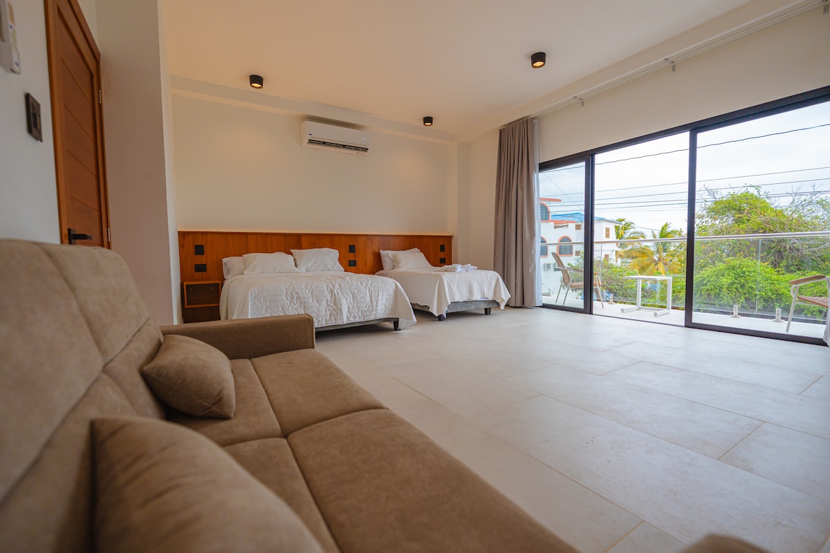 Suite Cielo, Discover the magic of Galapagos is located in a very privileged place, near the beach and other visiting sites, it has one of the best views of the Island, It is a spacious, comfy, with starlink wifi. The air-conditioned suite is fully furnished for 2 people and consists of 1 bedroom ( you can ask for 1 king sized bed or two single beds), a small kitchen&dining room area, a working place, a 32' screen with a streaming service, a private bathroom with hot water and a balcony.