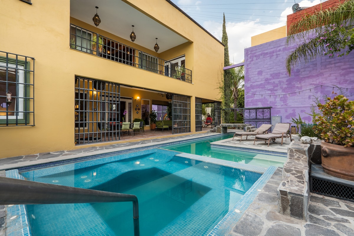 Nuestra casa está escondida detrás de una fachada modesta e histórica y un jardín estrecho y exuberante, a pocos pasos de la iglesia de San Juan de Dios, a menos de 10 minutos a pie de la plaza principal. Suites de 3 dormitorios, salas de estar interiores/exteriores, chimeneas, 4 patios, terraza, salón en la azotea con vistas a la ciudad y al atardecer. Partes de la pared de nuestro jardín datan del siglo XVIII. La casa fue diseñada en 2003 por el estimado arquitecto Juan Carlos Valdés, con elementos tradicionales, columnas de cantera, boveda y techos de vigas. Servicio de limpieza de lunes a sábado.