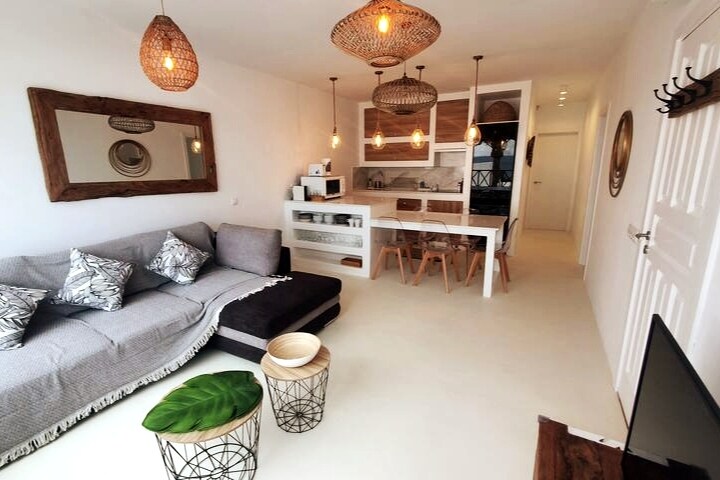 En el complejo Los Molinos se encuentra este bonito apartamento moderno de un dormitorio en planta baja, sin escaleras. Cuenta con cocina totalmente equipada, amplia terraza y hermosas vistas panorámicas a la piscina y las montañas. Dispone de WiFi, canales internacionales y aire acondicionado. El complejo ofrece piscinas, parking gratuito y parque infantil. A solo 4 minutos a pie de la playa Bastián, cerca de tiendas, restaurantes y supermercados.