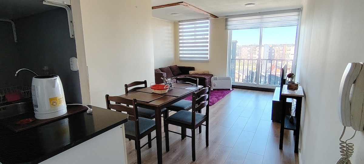 Departamento familiar equipado para recibir cómodamente a 5 huéspedes, con calefacción eléctrica, wifi, smartv, cocina, comedor y living equipados, espacioso balcón y estacionamiento privado. Cuenta con tres habitaciones, 1 cama de 2 plazas, 1 de 1,5 plazas y 2 camas de 1 plaza. La ubicación es excepcional, seguro, tranquilo, con supermercado a 5 minutos caminando, cercano a locales de comida y minimarket, locomoción a la puerta del condominio, a 10 minutos del centro de la ciudad.