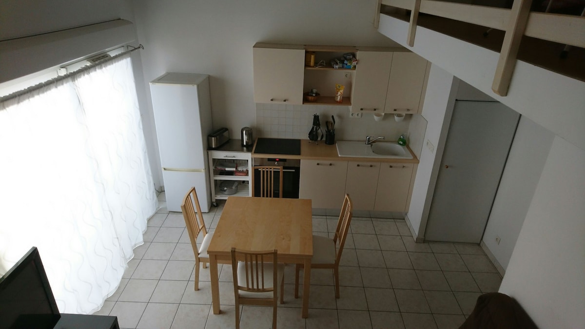 Estudio con terraza orientada al sur, con un altillo. Zona tranquila a 10 minutos del antiguo puerto de La Rochelle, a 10 minutos de la isla de Ré y a 2 minutos de la gran zona comercial de Beaulieu. Estudio de unos 30 m2, sala principal con cocina (equipada con horno, hervidor de agua, cafetera, tostadora y microondas) y zona de estar con sofá y TV. La zona de noche se encuentra en un entresuelo con una cama de 160*200 y una de 140*190. Lavadora a disposición del cuarto de baño.