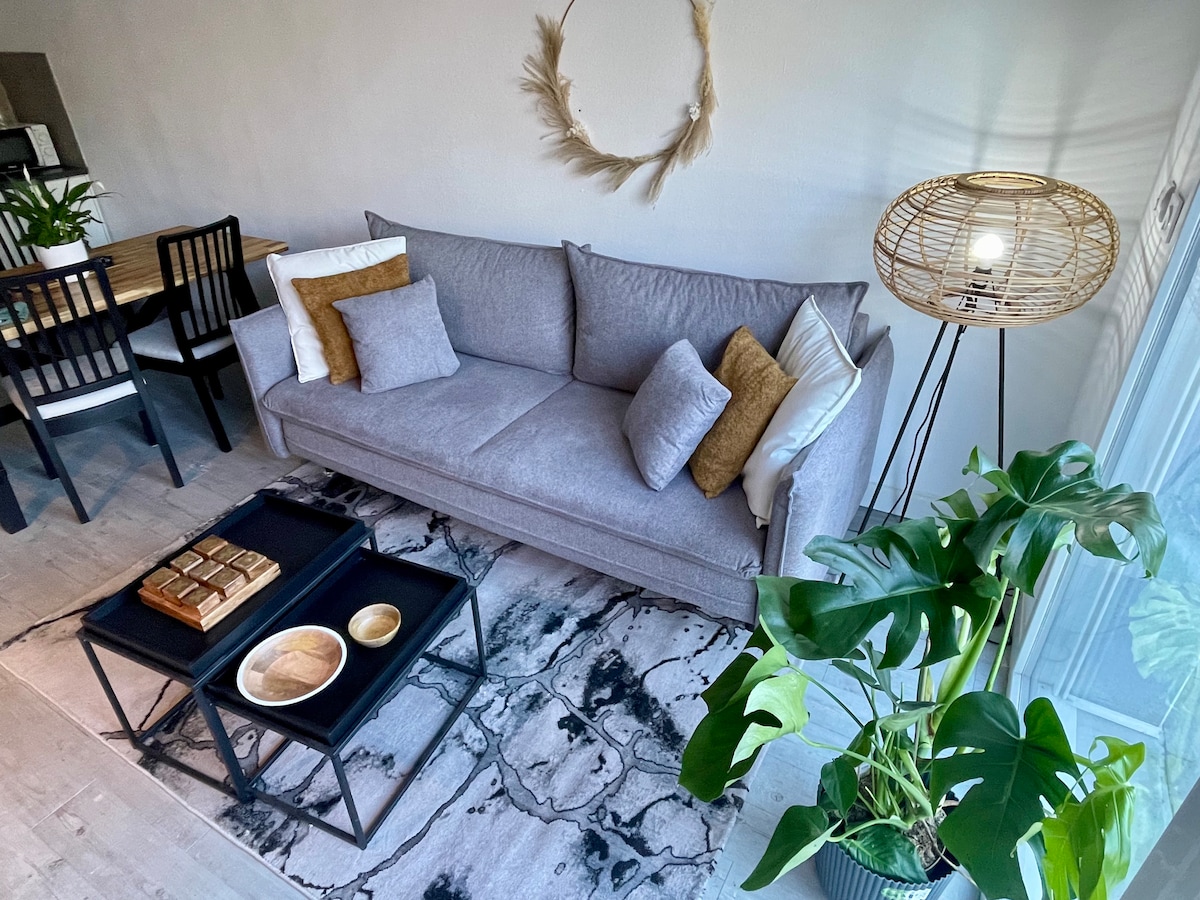 Acogedor apartamento de 39 m2 totalmente equipado en el centro de la ciudad (pareja, familia, profesionales) ✨ Puntos fuertes de su estadía: Hermosa sala de estar con cocina abierta y equipada Mesa de comedor para 4 personas Cálida sala de estar con sofá cama Habitación moderna (12 m²) Terraza privada con vista al paisaje arbolado Lugar de estacionamiento reservado y gratuito Planta baja (algunos escalones para acceder) 💼 Estadías profesionales bienvenidas (tranquilidad, alta velocidad, proximidad a servicios)
