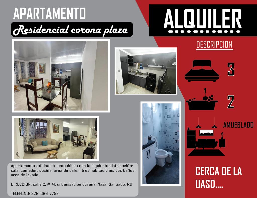 En este espacio estarás completamente seguro, desde la entrada contamos con acceso controlado y cámaras de vigilancia en todas las áreas. Tendrás un cómodo apartamento totalmente amueblado 3 habitaciones 2 baños Área de lavado Cocina Balcón Escaleras de emergencia Ascensor Piscina BBQ Área de niños Cancha multiuso Gym Billar y dominó Sendero para trotar A pocos minutos del aeropuerto internacional del Cibao y centros comerciales