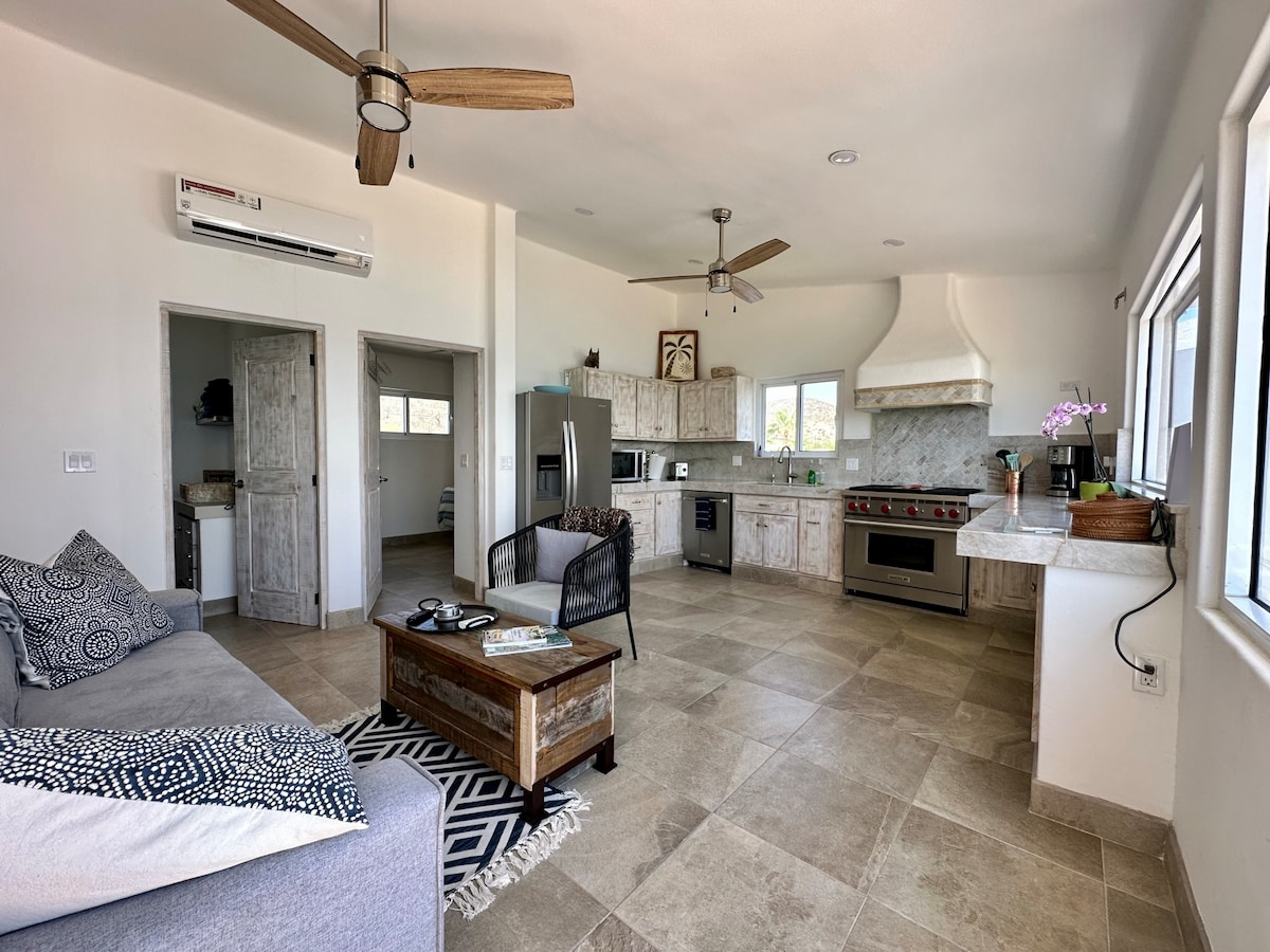 Ubicada en la montaña, la casa de la colina con cama tamaño king tiene tres ventanas grandes y una terraza con vista al valle del desierto y al Parque Nacional Marino. La casa se encuentra al final de una carretera que se suma al carácter tranquilo y silencioso de Cabo Pulmo, pero está lo suficientemente cerca y a 10 minutos a pie de tiendas de buceo, restaurantes y rutas de senderismo. Este alojamiento tiene Starlink. La casa no está preparada para fiestas, música ruidos y niños menores de 12 años. Hay estacionamiento en el lugar.