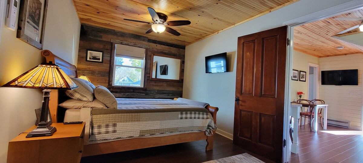 Luxury accommodation which sleeps 6 people! Relax in a your quiet retreat and enjoy the downtown area at your leisure. Beautiful all wood interior with lofted ceilings & fireplace, fully equipped kitchen, living room, outdoor area with gas grill & corn hole game. Plentiful parking and golf cart rental available!