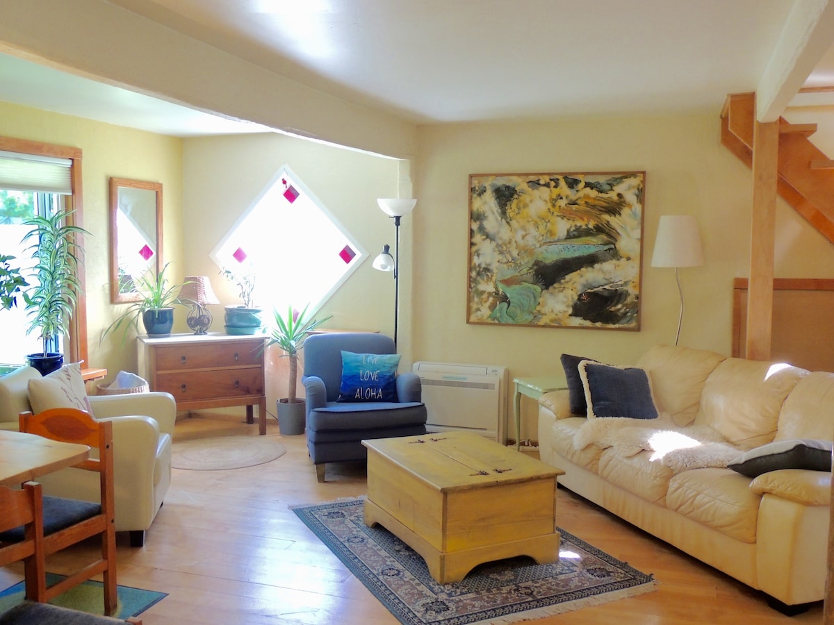This snug, hand-built cottage features large windows and a deck looking toward Hague Lake and the rocky scapes of Turtle Island. It’s tucked away in a small grove of towering Cedar and Fir trees, but in the heart of uptown Mansons Landing with stores and a bakery cafe just steps away. It is ten min. walk to swimming, paddle boarding and kayaking at kid-friendly Sandy Beach, or a 15 min. walk down to an ocean beach and Mansons Lagoon. Friday Market and Cortes Museum are a short stroll away.