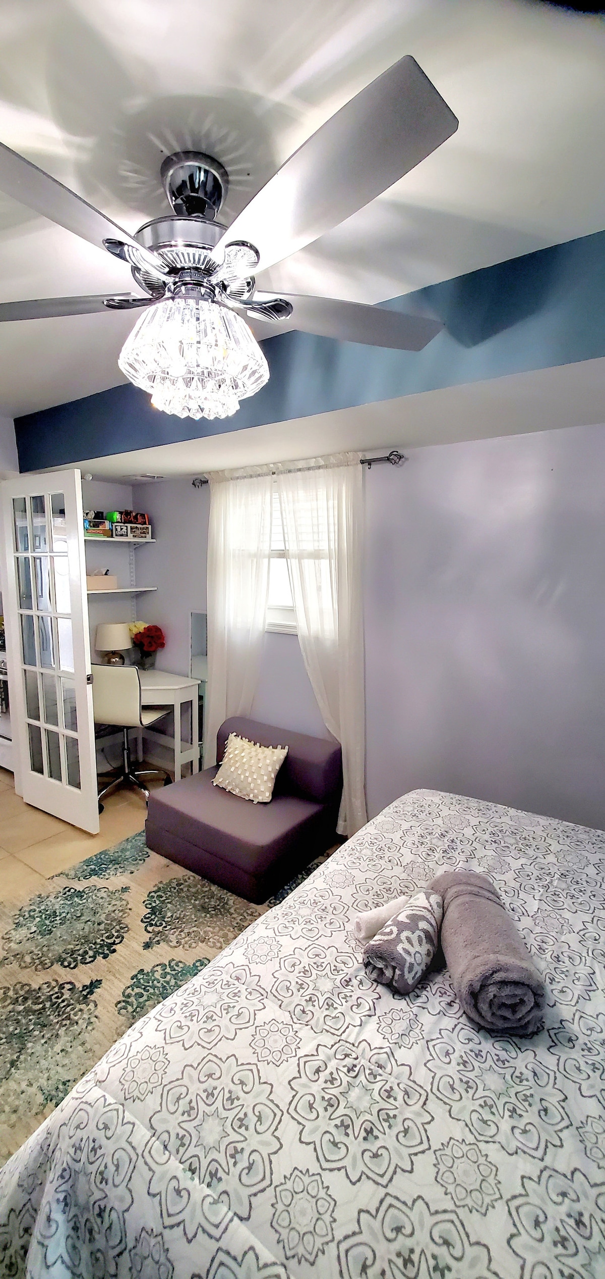 - Sunshine Dream Bienvenido a tu serena y espaciosa habitación privada de color amarillo suave, diseñada para proporcionarte una estancia tranquila y relajante. La habitación está amueblada con una cómoda cama doble, dos cómodas de 2 cajones, un escritorio y una silla para realizar algún trabajo esencial mientras viajas, un televisor inteligente de 55 pulgadas completo con sábanas y almohadas suaves y lujosas, lo que garantiza una noche de sueño reparador. En general, esta habitación tranquila y relajante ofrece un santuario perfecto para que te relajes y recargues las pilas.