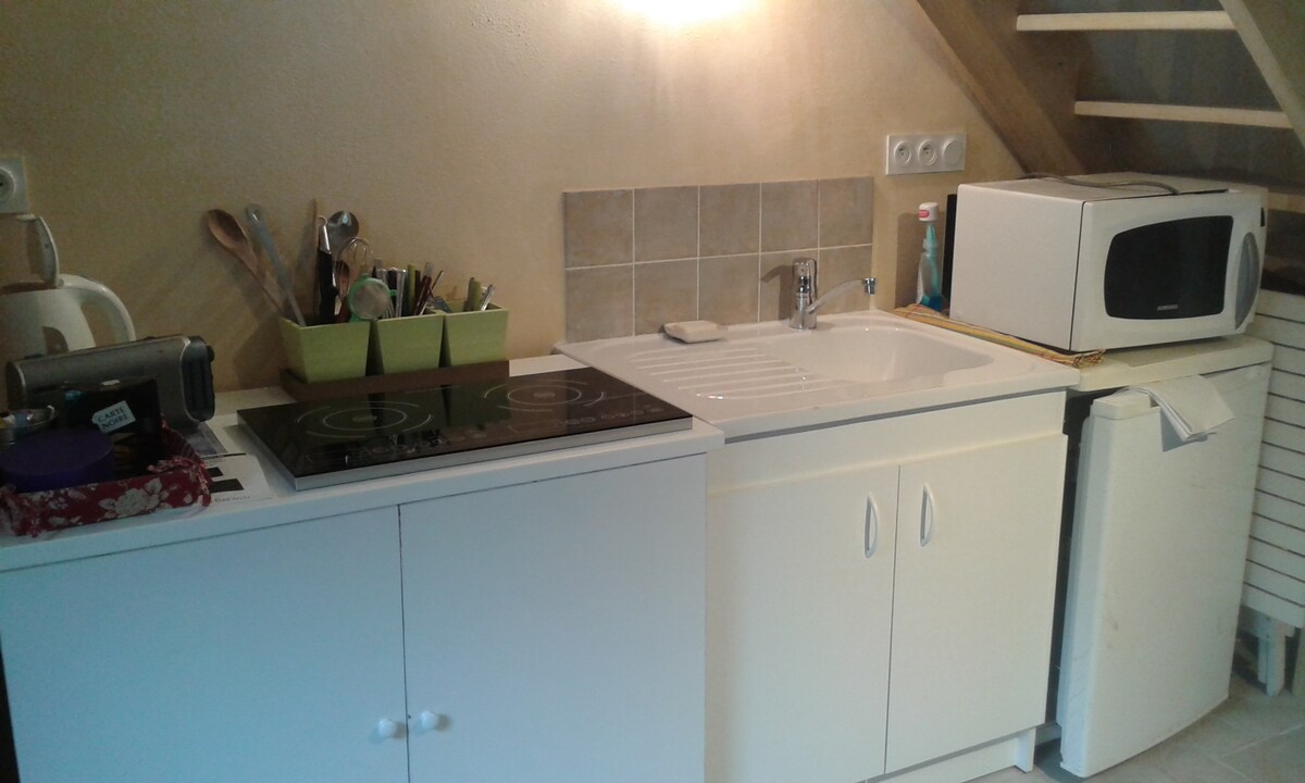 Esta casa de campo en el corazón de un pueblo, tiene una habitación principal con una zona de cocina (placas de inducción, horno mixto, nevera), un sofá, una mesa (plegable) con 4 sillas, un baño, y un gran dormitorio de arriba, una mesa que se puede utilizar para trabajar ( wifi de buena calidad), una cómoda, un armario. Posibilidad de comer fuera y utilizar la piscina.