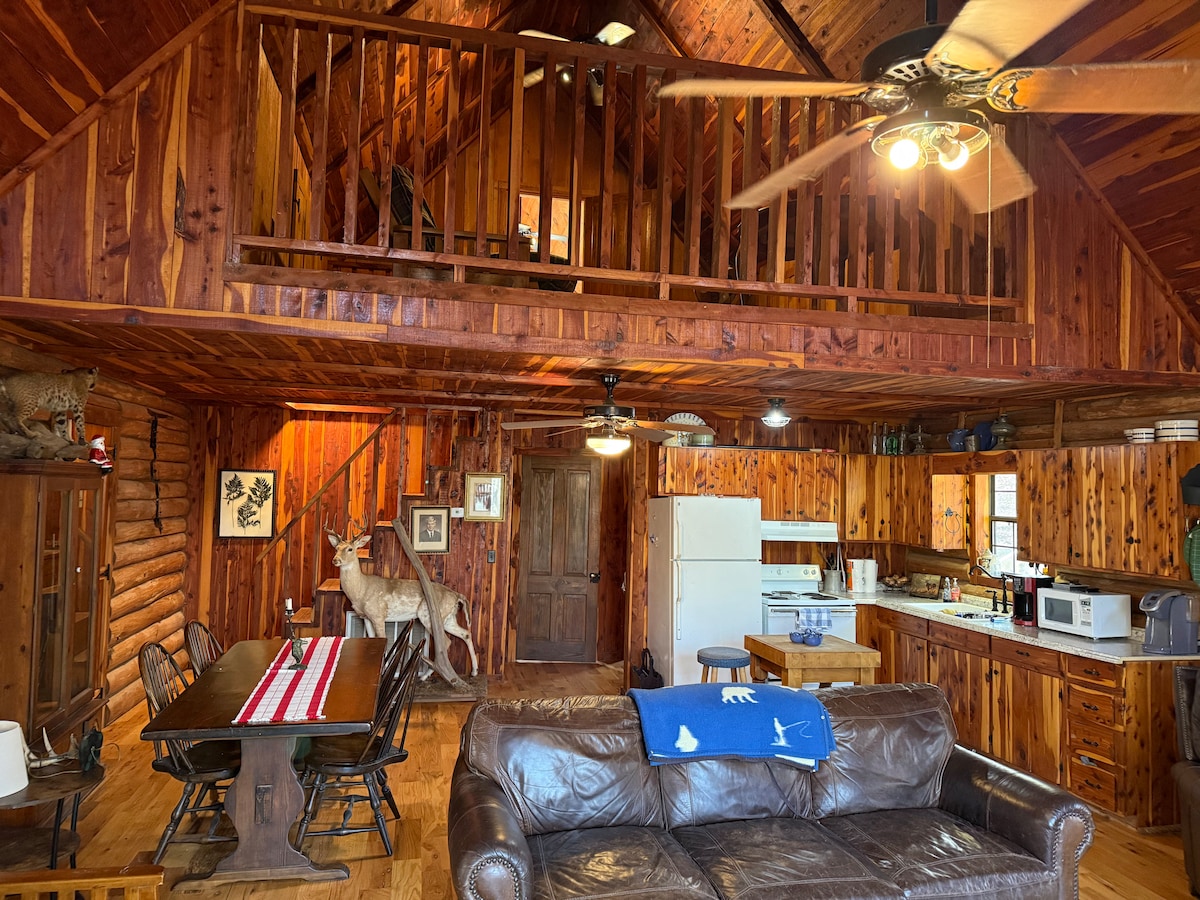 Kenny’s Cabin is a charming cedar log retreat that greets you with the warm, natural aroma of wood the moment you step inside. Nestled alongside of a beautiful hillside, the cabin overlooks a serene, spring-fed creek that flows directly into Pataula Creek—perfect for relaxing and enjoying nature. The cabin has 2 bedrooms 1 bathroom, a spacious loft, offering plenty of room to unwind. The primary bedroom includes a king-size bed, while the loft provides a queen-size bed and a futon couch.