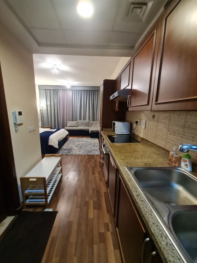 Un estudio totalmente amueblado con una entrada inteligente y un balcón con vistas al parque del vecindario Baño y cocina, nevera y microondas, TV inteligente de Netflix El barrio de Al Waha está a 10 minutos de la playa de Al Bilisan.