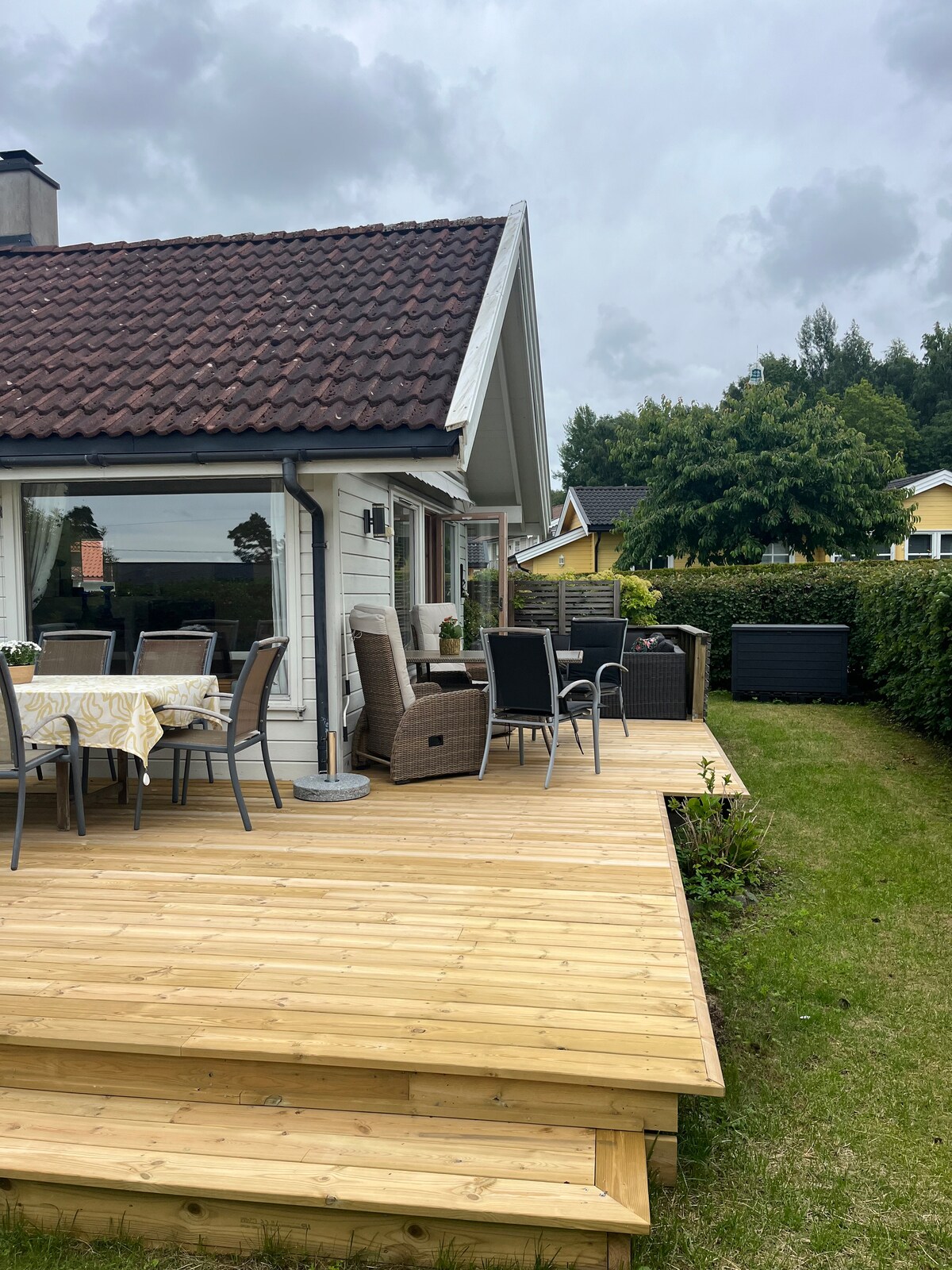 Disfrutá del jardín, el invernadero, la casita de juegos y el arenero. Camina 80 metros hasta las rocas y la zona de baño, camina 400 metros y encontrarás minigolf, playa, freesbegolf y cancha de vóley-playa. Puerto deportivo y restaurante a 1 km. Senderos para caminar 1 cama doble, 1 sofá cama doble, colchón adicional para sofá cama en el armario en la lavandería/trastero. 1 cama individual, 1 cama de bebé y 1 cama de viaje para niños. Toallas, ropa de cama, café, té, azúcar, especias, toallas de papel, papel higiénico, toallitas húmedas y varios jabones están en el departamento y se pueden usar.