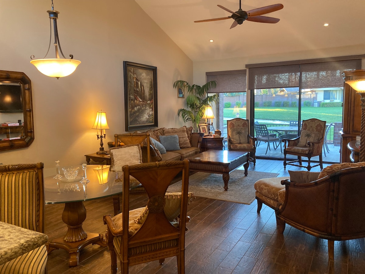Llegada a la 1:00 p. m., no pierdas un día de tus vacaciones esperando para hacer el check-in a las 4:00 p. m. Disfruta al máximo de tu viaje. 1600 pies cuadrados 2 camas+oficina con cama/ 2 baños casa en el desierto de palmeras en un hermoso club de campo privado de Monterrey. La casa se respalda en un campo de golf privado de 27 hoyos. Remodelado con muebles nuevos, camas de alta gama y sábanas. 3 televisores inteligentes de pantalla plana. Toneladas de restaurantes y tiendas a menos de una milla de la casa. A 250’de la piscina/spa comunitaria más cercana, 37 en total en la comunidad privada.