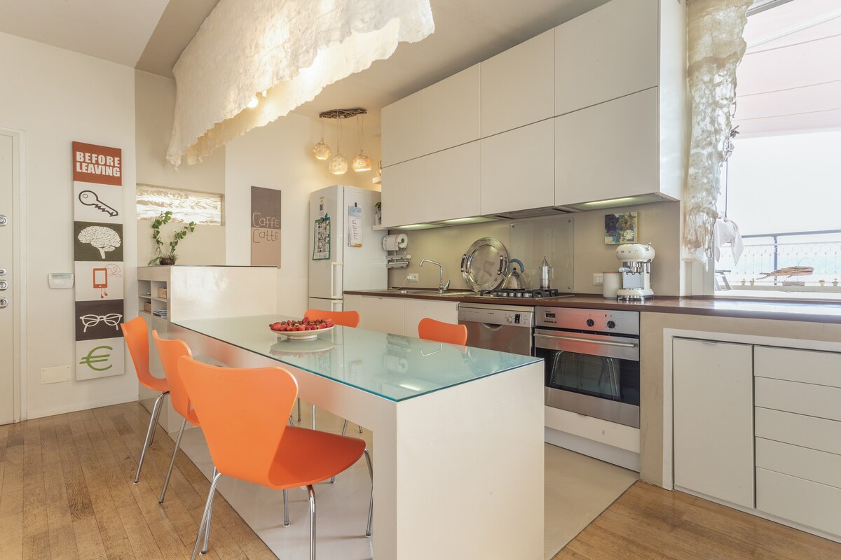 Bright lakeside apartment with stunning views of the lake and mountains. Renovated in Scandinavian style, it has a spacious open-plan area (living, dining, kitchen), three bedrooms, two bathrooms (one is 0.80 sqm), a balcony, and a large terrace. This is my home, filled with my original artworks. As an artist, I prioritize ecology and recycling. Free parking is available. Perfect for a relaxing stay on Lago Maggiore, blending nature, art, and sustainability.