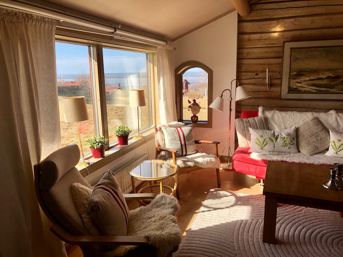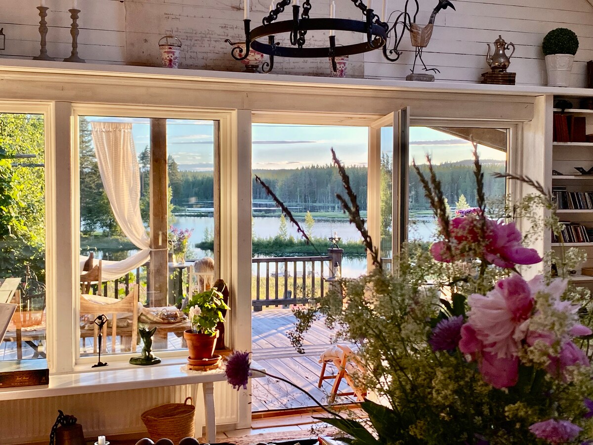 Una casa diferente y fabulosa con espacios abiertos, un fantástico porche con vistas al lago y al dorado sol de la tarde, un dormitorio decorado con fantasía e historia y un ambiente muy tranquilo y silencioso. Gran parcela privada y prado hacia el agua, 1 vecino y por lo demás bosque alrededor, pero cerca de la aldea de la fábrica de hierro histórico-cultural y "älvön"; promontorio con barbacoa y zona de baño. A poca distancia a pie del campo de golf de 18 hoyos. En la zona hay muchos lugares de interés y playas de arena vírgenes. (Nota: todavía faltan algunas cosas, como algunas molduras de techo). ¡A menudo hay juegos y conciertos en el pueblo! :)
