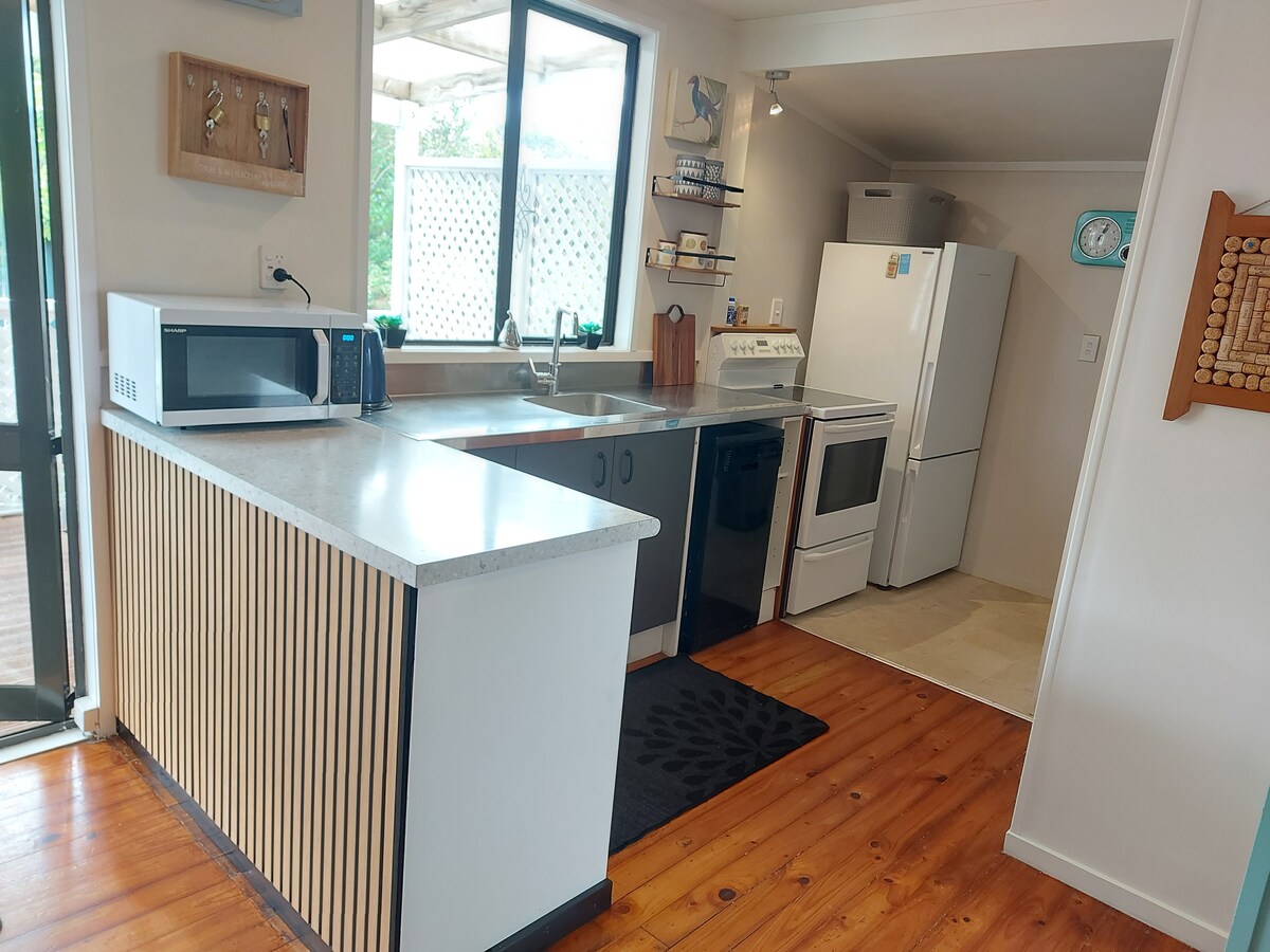 Estudio único. Separado de la vivienda principal con acceso propio y autónomo. Un espacio luminoso y amplio, diseñado originalmente como un estudio de arte. El espacio incluye una cama tamaño queen, dos sillas cómodas, una heladera pequeña con té y café, y ducha e inodoro. Acceso a las instalaciones de lavandería en la casa principal si es necesario. A 1 minuto a pie de la playa, a 1 minuto en auto o a 10 minutos a pie de una gran selección de restaurantes en Orewa. A cinco minutos de la autopista, a 30 minutos del puente del puerto.