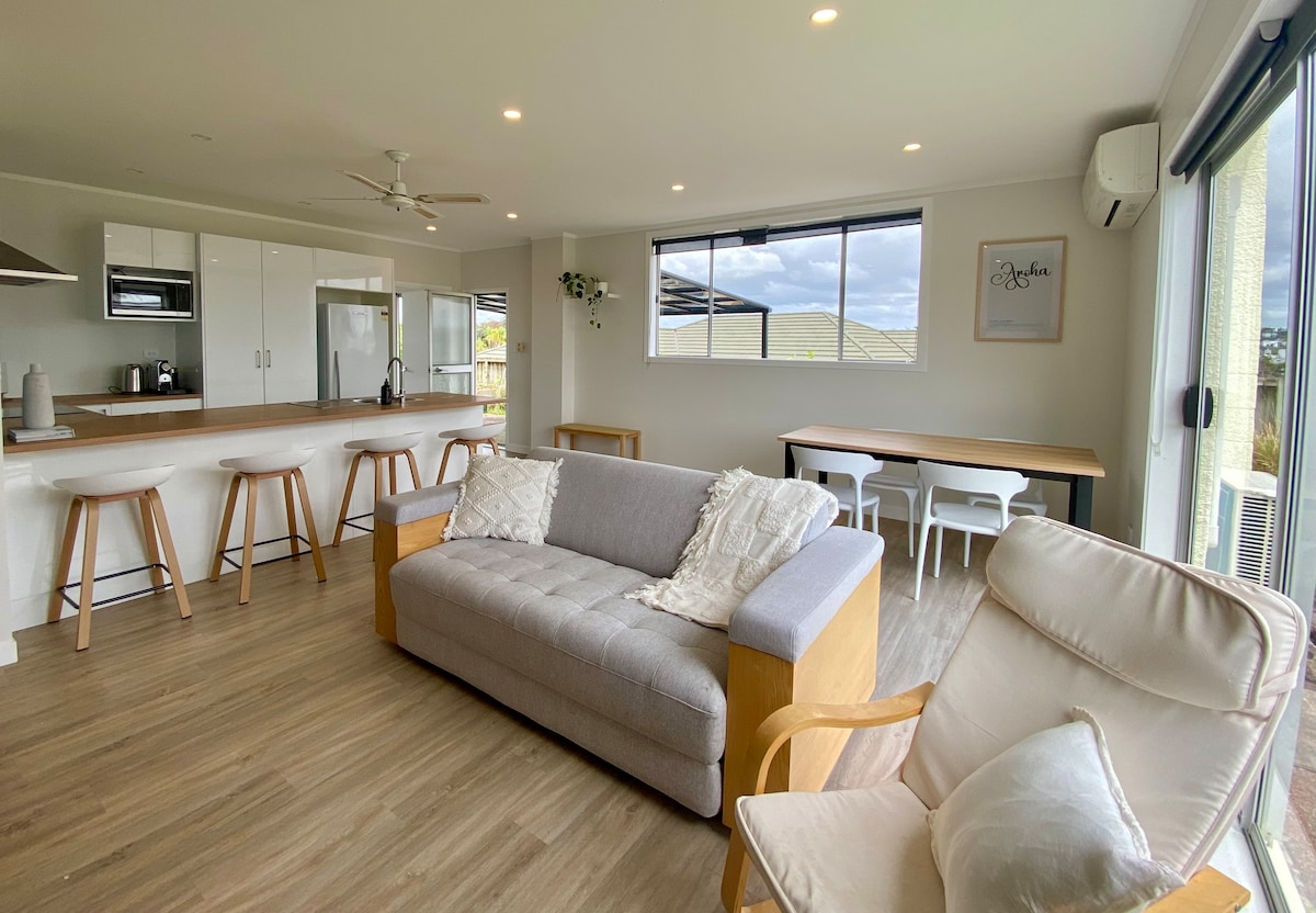 Designed to capture the sun and the sweeping ocean view. Wood-burner for cosy winter nights and unlimited fibre broadband wifi for Netflix. Pull back the ranch sliders in summer and open the house to the outdoors. Relax with dinner, drinks and the setting sun on the covered outdoor deck. Underfloor heating the bathrooms provides all year comfort. It's a 5min walk down the road to the start of the beach track and then a 20min stroll through the bush down to the beach (or a 3min drive!)