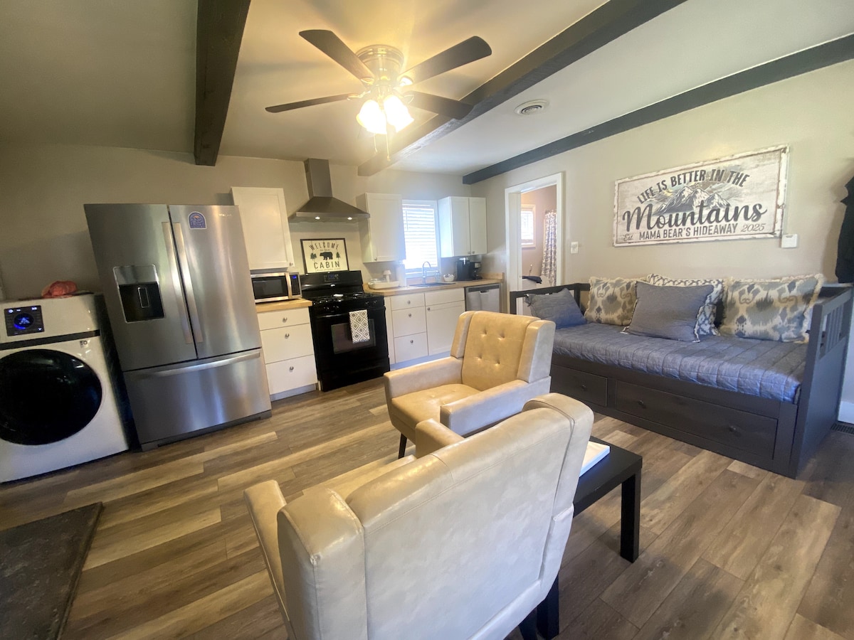 A clean and modern, newly renovated 1 bedroom, 1 bath cabin with full kitchen, living room, and gas fireplace. Cabin has 1 king bed and a day bed that turns into a king bed. Mama Bear's Hideaway is situated in the heart of Red River, 100 yards from the ski lifts, across the street from a convenient supermarket, walking distance to Steam Coffee and many other restaurants and shops. Other amenities include free Wi-Fi, fire pit, outdoor grills, private pond w/ fishing available. NO PETS allowed.