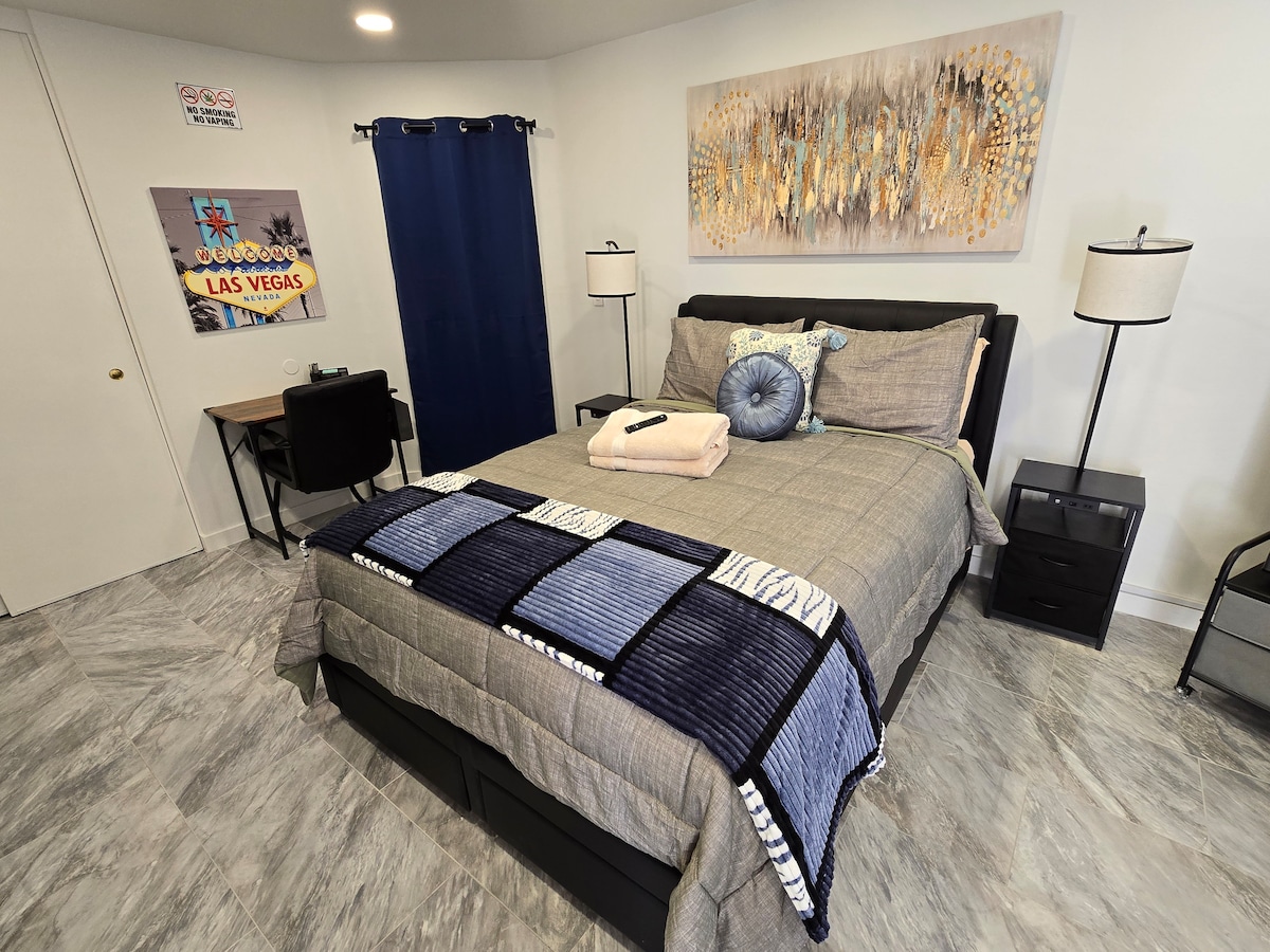 ¡Te damos la bienvenida a este acogedor estudio en Las Vegas! Este estudio es perfecto para relajarse y descansar durante tus vacaciones en la ciudad. Tendrás tu propio aire acondicionado con modo frío y calor y un televisor con Roku y Disney+. Estamos a solo 10 minutos de Las Vegas Strip. Puedes llegar al aeropuerto en 8 minutos. Redondeado por centros comerciales, mercados, bancos, etc. El estudio tiene entrada privada, cocina y baño. Solo el patio delantero es un área común donde puedes ver a otros huéspedes. Definitivamente te encantará.