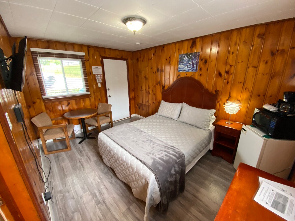 This waterfront unit features a private patio and was newly renovated in spring 2025! Room Two is a one-bedroom unit with a two double beds, an accessible 3-piece luxury bathroom, and a kitchen with a full-size fridge, stovetop, microwave, coffee maker, and air conditioning. Enjoy a TV with satellite service, free Wi-Fi, and complimentary use of the picnic area and fire pit by the beautiful Madawaska River.