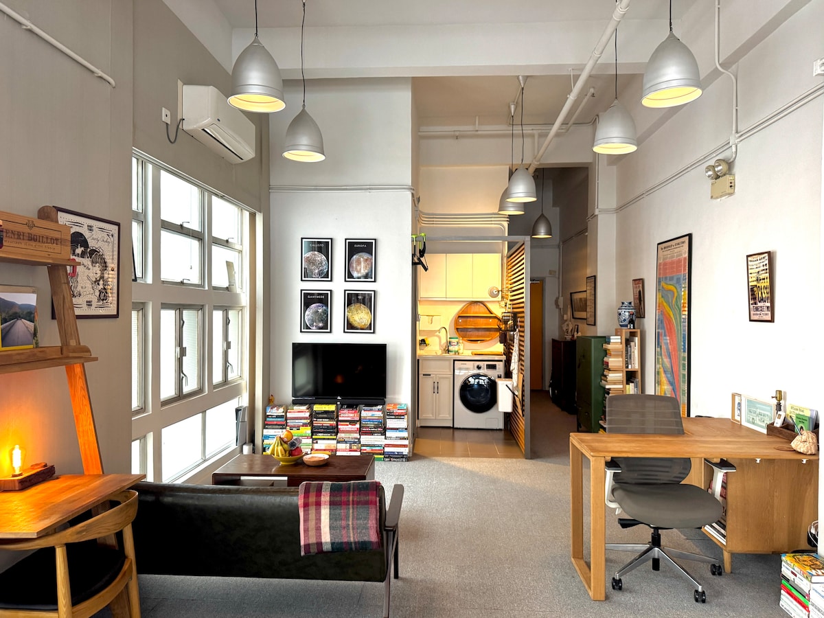 Disfruta de una experiencia elegante en este espacio comercial de estilo loft convertido con una cama tamaño king, luz natural, espacio de trabajo, diseño moderno, wifi rápido y estable, lavadora/secadora, equipo de ejercicio, bicicleta plegable, amplio espacio de almacenamiento, TV con Netflix y Playstation, Roomba y una azotea. El apartamento está a 5 pisos a pie, a 1 minuto a pie de la estación de metro de Sheung Wan. La ubicación es muy práctica. La cocina americana es básica con inducción, horno tostador, vaporera, utensilios, etc.