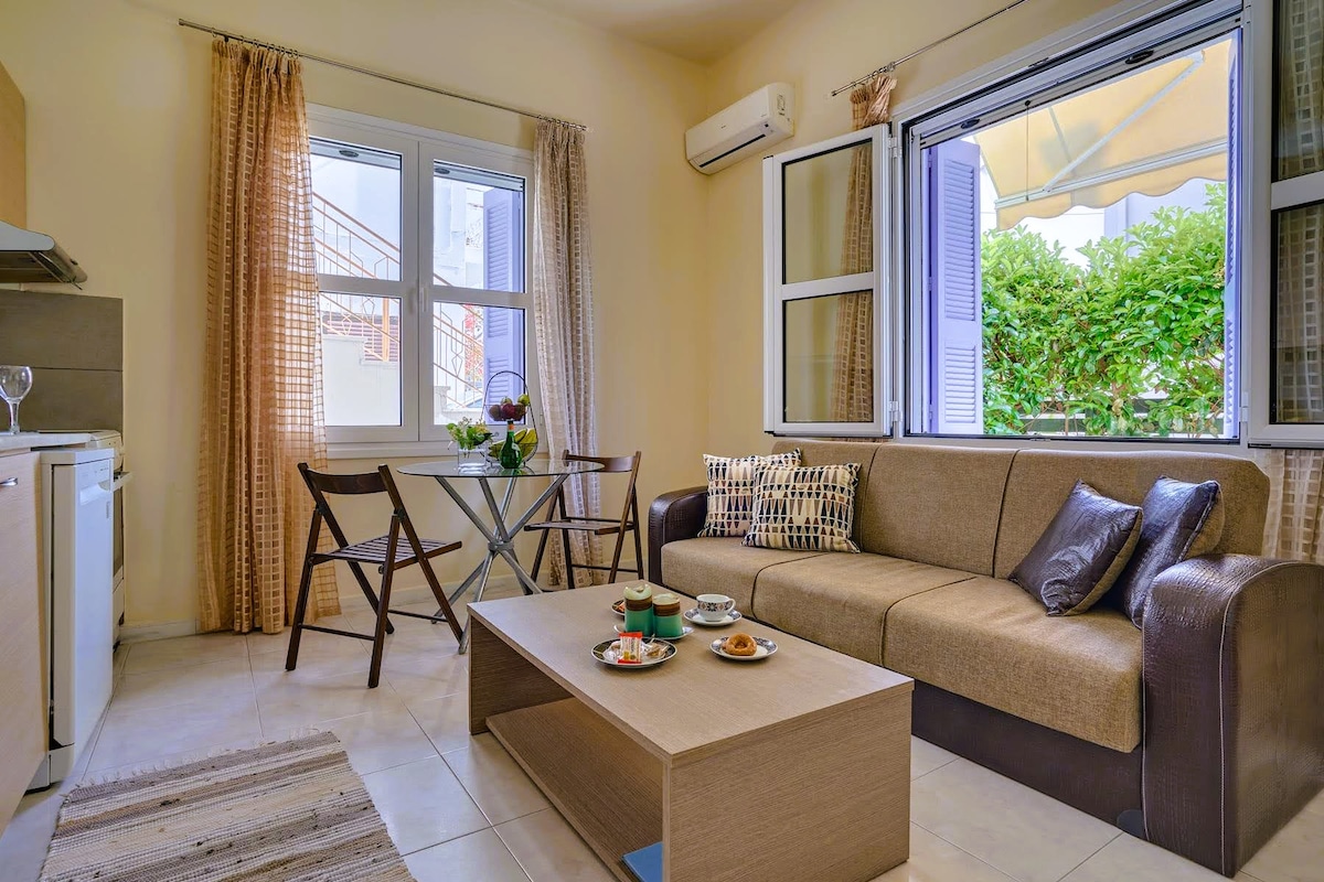 Este elegante y cómodo apartamento de 2 dormitorios está situado cerca del casco antiguo (a 350 metros). Consta de salón (aire acondicionado), 2 dormitorios (aire acondicionado), uno con cama de matrimonio y el otro con 2 camas individuales, cocina, baño, 2 balcones pequeños, puerta de seguridad y wifi. La entrada del edificio tiene unos pocos escalones y un pequeño ascensor. A poca distancia a pie encontrarás: Una gran variedad de tiendas que incluyen un supermercado y una farmacia, el centro a 20 minutos/1,6 km, la playa de Zefiros a 24 minutos/2,0 km, la playa de Elli a 27 minutos/2,2 km.