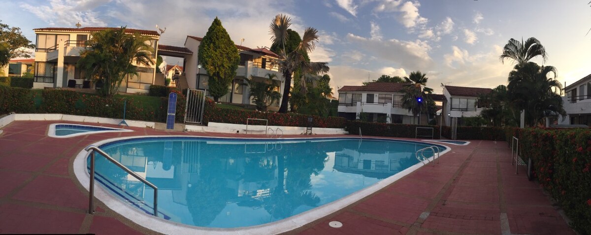 Disfruta tus días de descanso en un cómodo, amplio e impecable apartamento tipo casa. Condominio Hacienda La Estancia campestre. Equipado con menaje completo, BBQ a gas, hamacas, kiosco con mesa de ping-pong y WiFi. Piscina a solo 10 metros de la casa que podrá disfrutar hasta las 9 de la noche. Acceso a 6 piscinas más un tobogán, supermercado, capilla, restaurante, golf, canchas de tenis, fútbol y gimnasio al aire libre. ¡El lugar ideal para relajarte y divertirte con todas las comodidades!