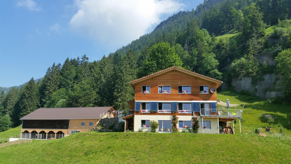 Alojamiento privado para dos personas en una bonita casa de madera con excelentes vistas a una granja en medio del campo. Oferta para dos personas, desayuno incluido. Se puede reservar una cena a la luz de las velas por 160 francos suizos (por favor, reservar con antelación). Pago en el lugar con Twint o en efectivo. La cocina se puede utilizar por una tarifa de limpieza de 25 francos suizos.