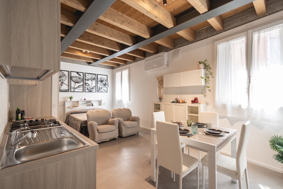 Departamento estudio ideal para estancias de negocios, parejas o familias. En el centro histórico de Rimini, cerca del Palacongressi, la estación (1 parada para la Feria) y el mar. Cama de matrimonio, sofá cama doble, cocina americana/barra de esquina con microondas, nevera, hervidor de agua, café Illy y mesa de comedor. Baño privado. Wifi rápido, TV inteligente, aire acondicionado y lavadora. Cuna y trona bajo petición. El estacionamiento, los restaurantes y los servicios están a poca distancia a pie. Acceso a la zona de Coliving con cocina equipada y sala de estar.