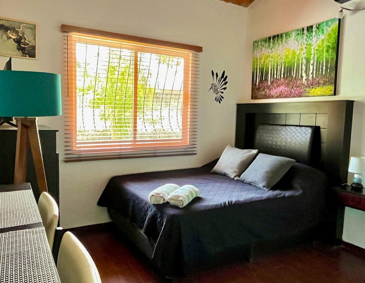 Welcome to your peaceful hideaway in the south end of Sayulita. This cozy, air-conditioned studio at Casa Aurora features its own entrance from the street, a private patio surrounded by lush garden, and access to a shared pool just across the road. With just an eight-minute stroll to the heart of town, you get the convenience of being close to restaurants, surf, café culture and shops, but the serenity of a quiet residential escape.
