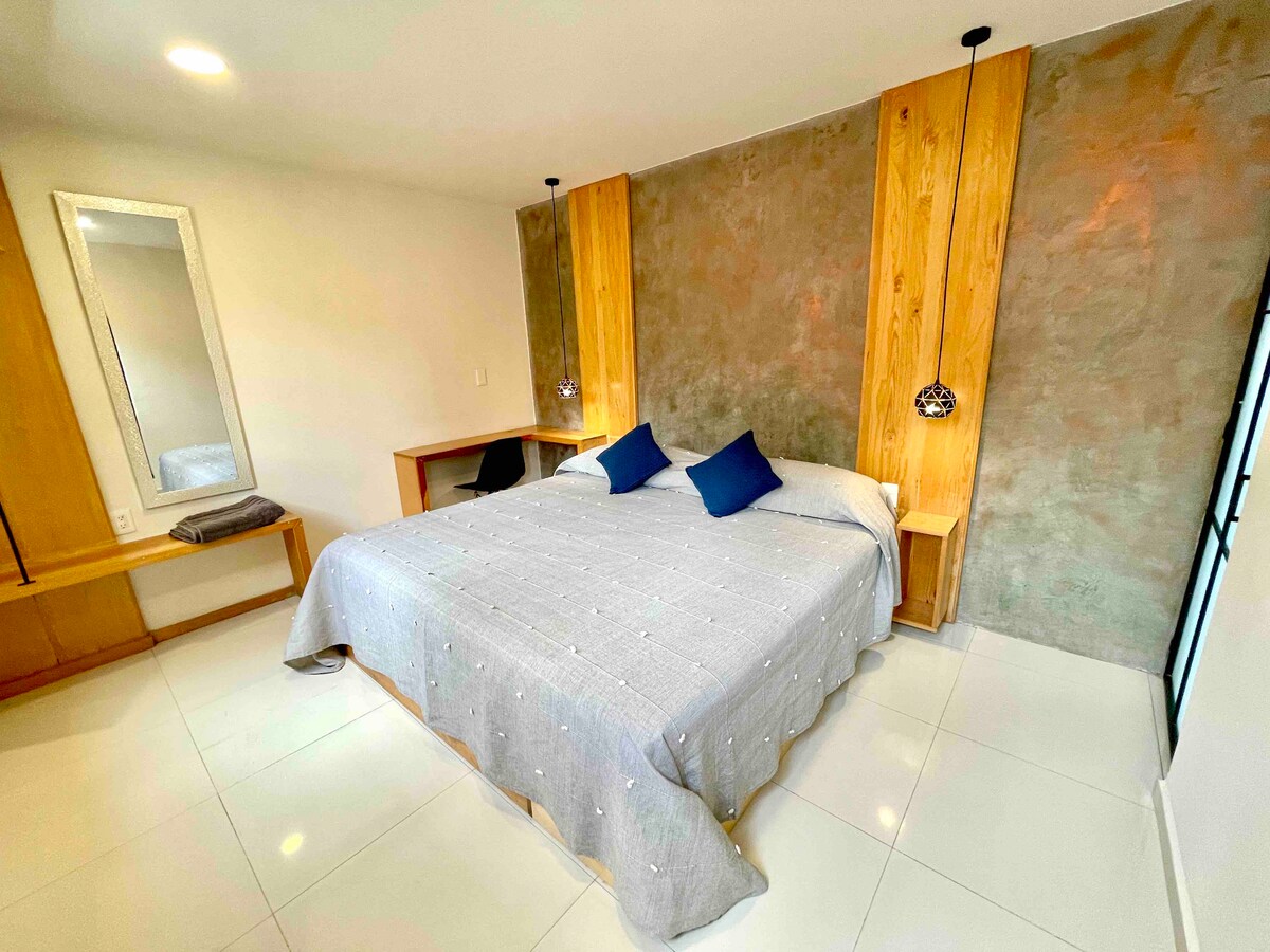 Este es un departamento moderno, privado con una ubicación perfecta—a 15 minutos del centro caminando y 5 en taxi. Es un loft abierto y luminoso en el tercer piso equipado con sala, cocina, recamara y baño completo. Comparte su acceso con un café en la planta baja, pero la entrada es completamente independiente. Este lugar es perfecto para huéspedes independientes y también para los que gustan de un toque de hospitalidad.