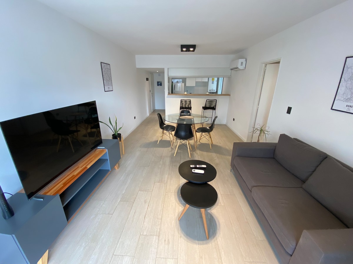 Luminoso departamento de 60 mts, espacioso, funcional con especial atención en el diseño y la decoración. Dormitorio con cama matrimonial, sofá cama, escritorio, balcón con living, baño, cocina completa y cochera. Sector de parrilla en la terraza. Dos smart tv (una con deco flow HD - otra digital), uno en el dormitorio principal y otro en el living. Ubicación estratégica, a metros de los principales accesos y medios de transporte, restaurantes, mercado de frutos, casino, paseos en barcos, etc.