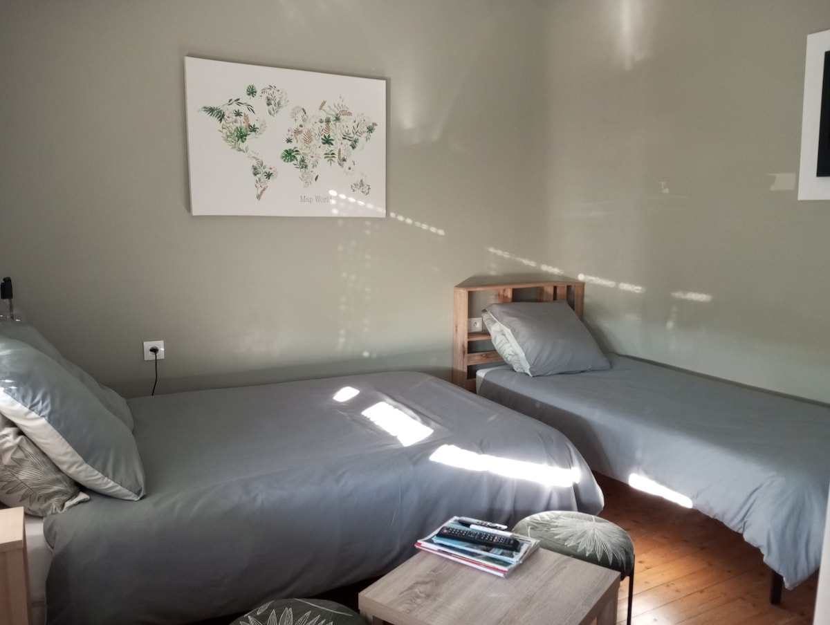 Habitación de huéspedes cama doble y una cama individual para un tercer viajero posible en la reserva,tranquilo con una TV. Un baño refinado, al lado de esta habitación, con lavabo doble y ducha italiana. toallas incluidas y cama hecha . . WC independientes. Cuna (gratuita previa petición). Podrá disfrutar de un desayuno abundante (de cortesía) frente al jardín o en la cocina según el clima, en la ruta euro bicicleta, los ciclistas son bienvenidos, lugar de almacenamiento seguro.