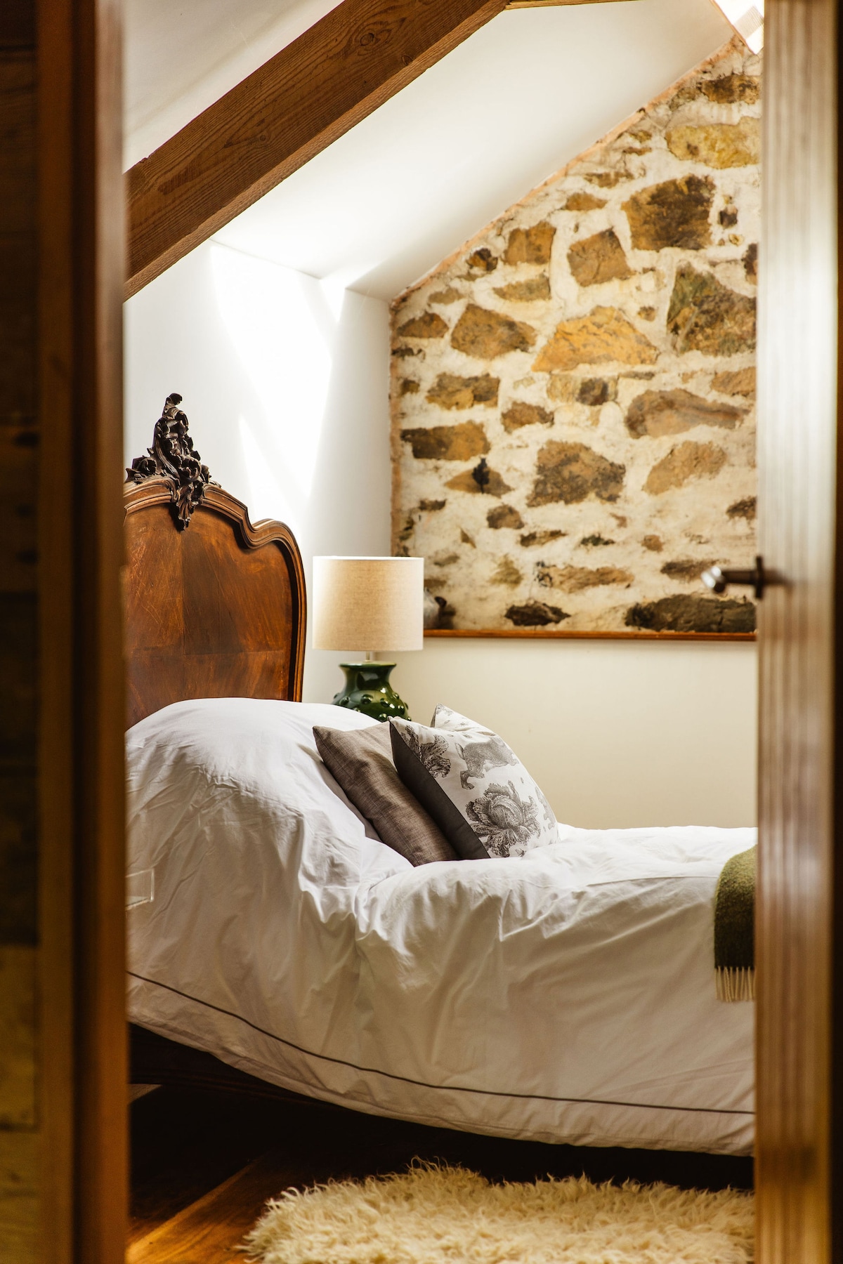 Este espacio luminoso y amplio tiene mucho carácter con vigas de roble expuestas y un piso de madera de roble, una ventana de vidrio en el techo ilumina la habitación y te permite mirar las estrellas desde tu cama por la noche. Una cama francesa antigua le da un toque romántico a la habitación con ropa de cama fresca, hay un baño y una lujosa bañera antigua de doble extremo. Los huéspedes tienen uso exclusivo de "The Loft", con una cocina y comedor y también pueden reservar una experiencia de sauna privada y/o una sesión de jacuzzi privado con leña.