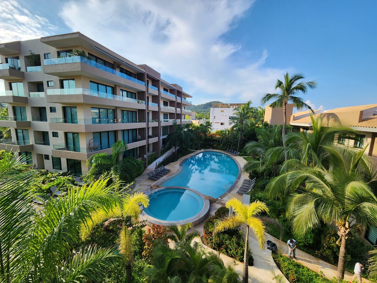 Great speed WiFi reliable for working remotely, Cozy apartment in Sayulita downtown just 2 blocks away from the beach. 2 bedroom and 2 sofa beds, capacity 6 pax total. Garden area and large room with high ceilings giving a balance of luxury and comfort, for relaxation and tranquility. You can enjoy coffe shop, bars and restaurants to delight your palate just a few steps away, it includes air conditioning, automatic controlled access, parking space, incredible lounge pool.