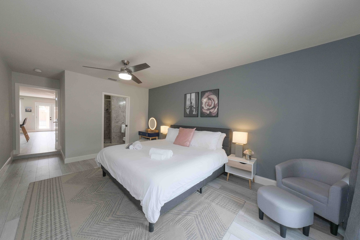 Nuestra escapada para huéspedes está ingeniosamente decorada para brindar comodidad y facilidad al alojarse en nuestro "hogar lejos de casa". Vas a encontrar alojamientos limpios y acogedores para que te sientas como en casa. El patio trasero está vallado con mucho espacio para ti y tu familia. ¡Damos la bienvenida a mascotas (con tarifa por mascota) y niños! Se permiten 2 mascotas con tarifa plana por mascota. Si tenés más de 2 mascotas, comunicate con nosotros para explicarnos. Se aplican tarifas adicionales.