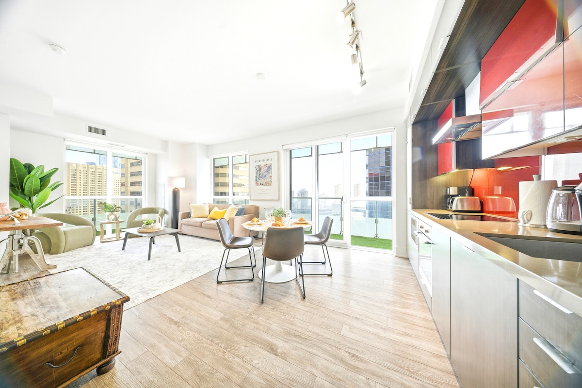 Stylish 2-bedroom condo with free parking. 2 Queen bedrooms and a queen size sofabed Enjoy a bright, spacious layout with premium finishes, full kitchen, in-suite laundry, fast Wi-Fi, and hotel-style service. Steps from the CN Tower, Rogers Centre, Metro Toronto Convention Centre MTCC, and top dining. Perfect for guests seeking comfort, convenience, and an elevated downtown Toronto stay.