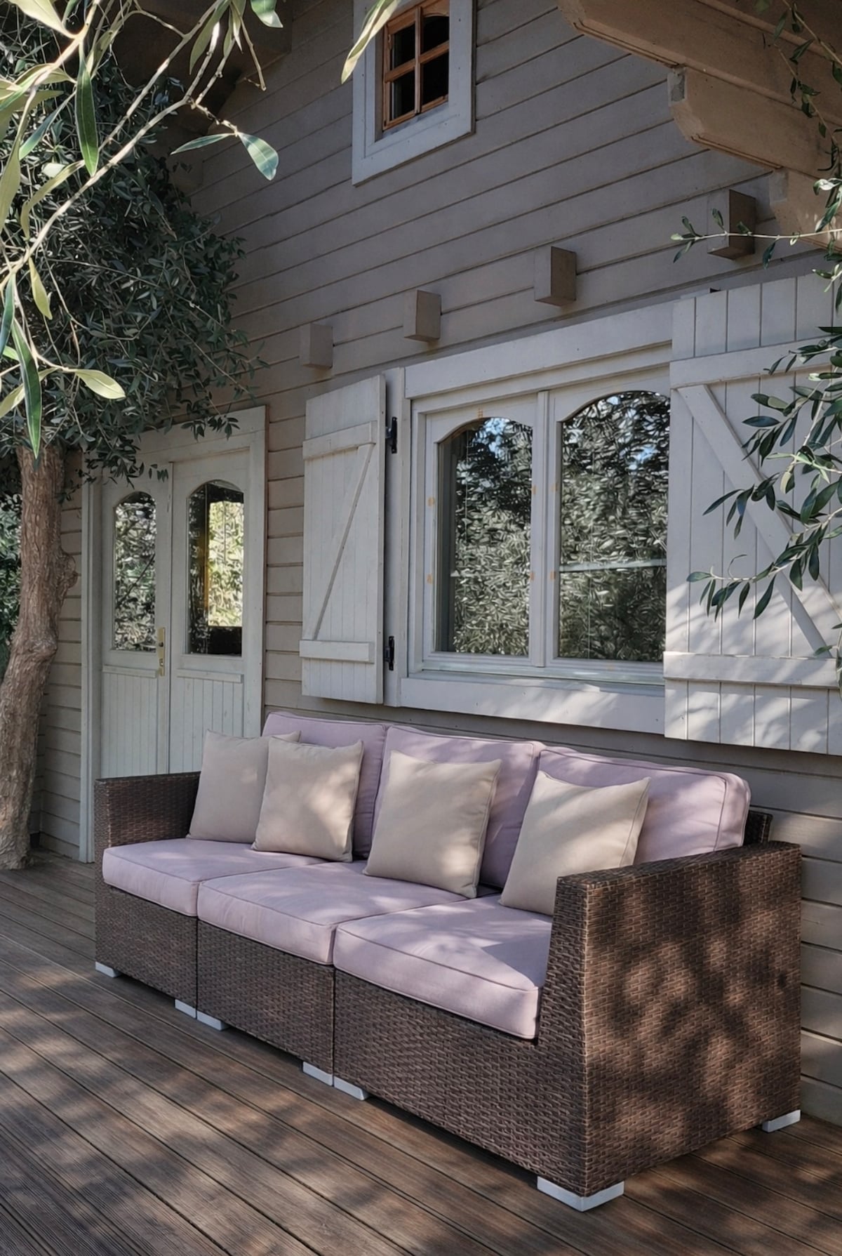 www.villa-exotica-frenchriviera villa et cottage sur cette page ! Décoration à l’ esprit cosy , atypique, et originale avec un arbre vivant à l’ intérieur du salon . Plancher, table et mobilier en bois , béton ciré dans la cuisine et salle de bains . Vasques en pierre provenant de Bali . Colonne de douche avec pluie . Canapé lit convertible en 140/190 cm Lit en 140/190 Pour votre tranquillité, le cottage est équipé de moustiquaires à toutes les fenêtres 😉