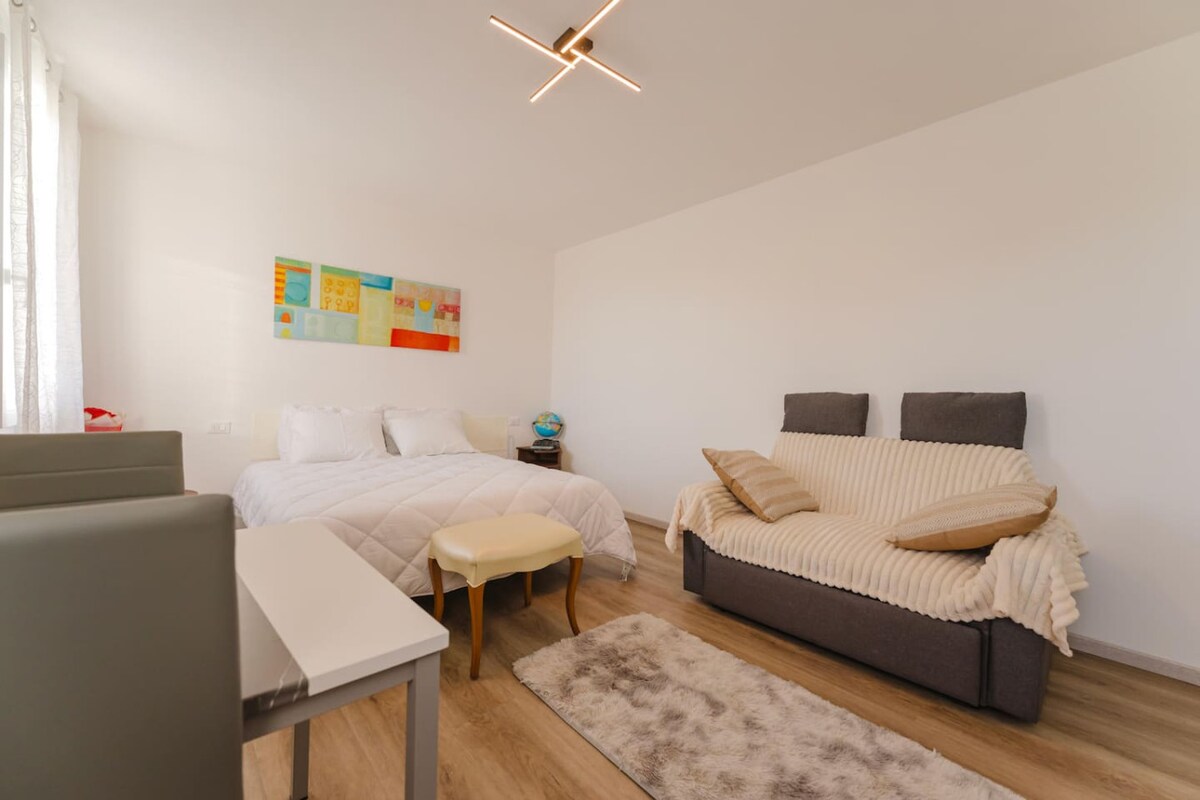 Apartamento con entrada independiente, primer piso. Compuesto por una luminosa sala de estar y una amplia cocina. Dos dormitorios, uno de ellos doble y otro con una cama individual convertible en doble. Baño con ducha. Muebles nuevos. Una terraza. Wifi (Eolo, 30 mb). Suelo radiante y aire acondicionado con bomba de calor. Jardín. Aparcamiento. A cinco minutos en coche del centro histórico de Castelfranco Veneto y a veinte a pie. En tren se puede llegar a Venecia, Padua y Treviso.