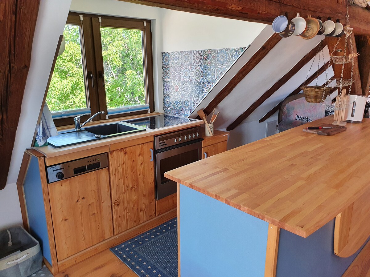Nosotros, "ZurMelberi", vivimos en la zona recreativa "Lago de Franconia". Si te gusta la tranquilidad y quieres llegar rápidamente al paisaje del lago, estás en el lugar correcto. Nuestro pueblo pertenece a la ciudad de Spalt, a 7 km de distancia. El apartamento de vacaciones con aire acondicionado en el ático en diseño de estudio es adecuado para un máximo de 4 personas a partir de 18 años. Hay rutas directas de senderismo (entre otras, el Camino de Santiago) y ciclismo que parten de nuestra casa. El uso compartido de la piscina es posible en cualquier momento. Hay una terraza privada disponible.