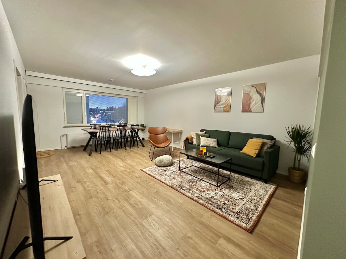 ¡Te doy la bienvenida a este espacioso refugio en el Ártico! Preparate para instalarte en tu verdadero hogar lejos de casa en el corazón de Rovaniemi. Este departamento hogareño cuenta con tres dormitorios privados, sauna y balcón. Con 120 m² en el último piso, este departamento ofrece el espacio generoso y las características personalizadas de un verdadero hogar, perfecto para familias más grandes o grupos de hasta ocho huéspedes. Equipamos completamente el espacio con todo lo que necesita para una estadía relajante y sin estrés en Laponia.