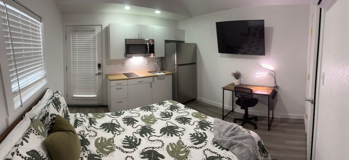 Relájate en este espacio tranquilo y elegante. Habitación privada con baño privado y cocina, entrada privada con cerradura inteligente. La habitación es similar a una habitación de hotel, diseñada para dos personas, es un lugar acogedor y práctico. Consta de un patio en la entrada donde se puede fumar o relajarse. Tiene una cama Queen, espacio para trabajar, Smart TV de 50 in, microondas, horno/tostador, olla arrocera, cafetera, refrigerador y secadora de cabello.
