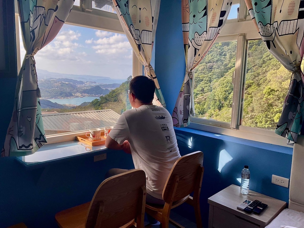 一天只接待一組客人,最多可加至6人,如需加床請事前訊息告知 獨享整棟兩層樓空間,包含一樓戶外庭院 山海景露台、室內客廳及廚房;二樓房間衛浴,躺在床上就可享受一大片的風景。 位於九份老街與黃金博物館中間,旁邊為知名餐廳食不厭,距離公車站牌步行約1分鐘 -距離九份老街步行約20分鐘,車程約8分鐘,公車可到達 -距離黃金博物館步行約20分鐘,車程約8分鐘,公車可到達