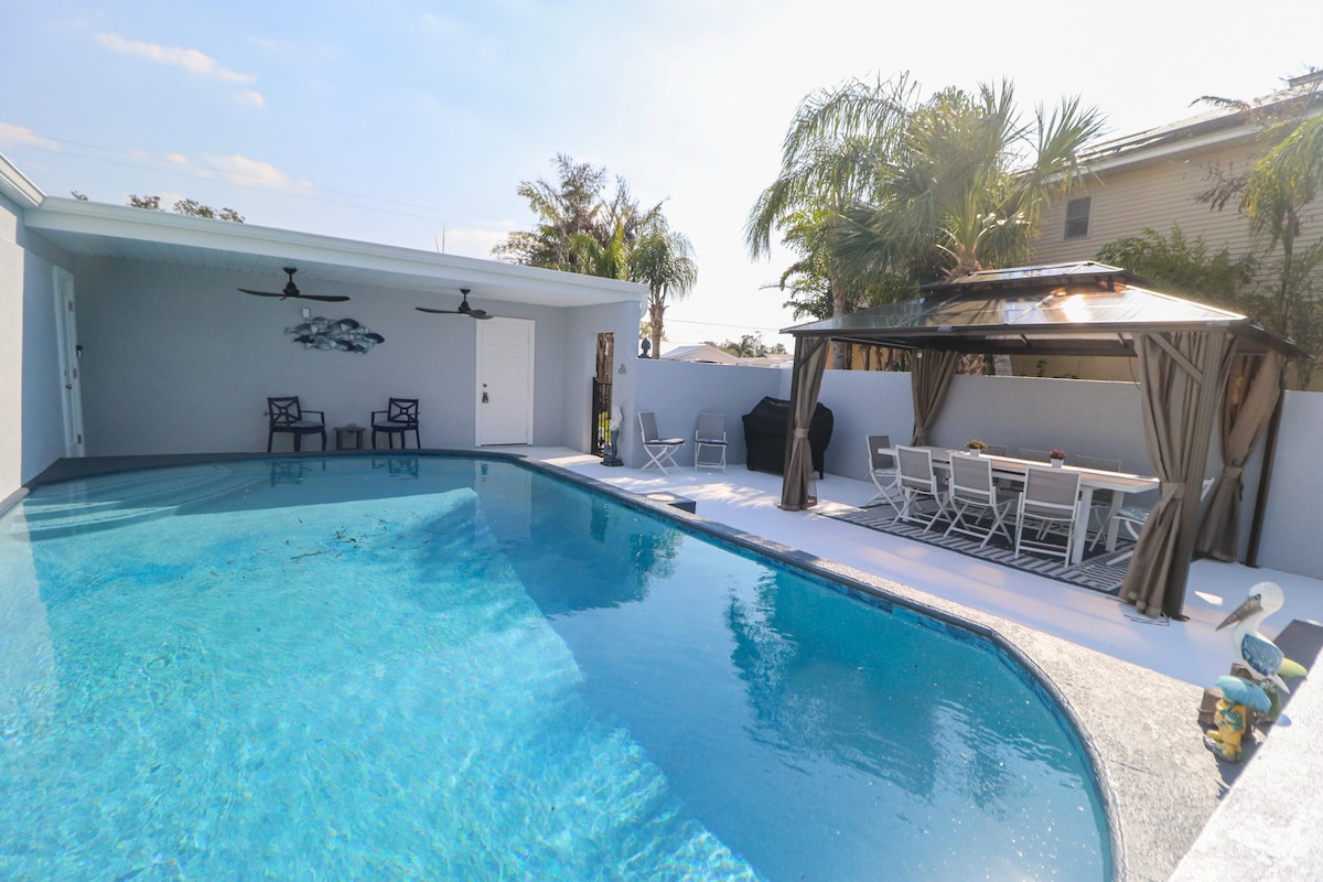 Escápate a esta casa con piscina frente al canal, perfecta para familias o grupos que buscan relajarse y volver a conectarse. Con 4 dormitorios, 2 cocinas, una sala de juegos y un muelle privado, hay espacio para que todos se relajen. Nada en la piscina, asa en el patio trasero o disfruta de una noche de cine en una de las dos salas de estar. A solo 30 minutos de Tampa y a minutos de playas, puertos deportivos y restaurantes frente al mar. Este refugio apto para perros ofrece el verano de Florida que tu familia merece.
