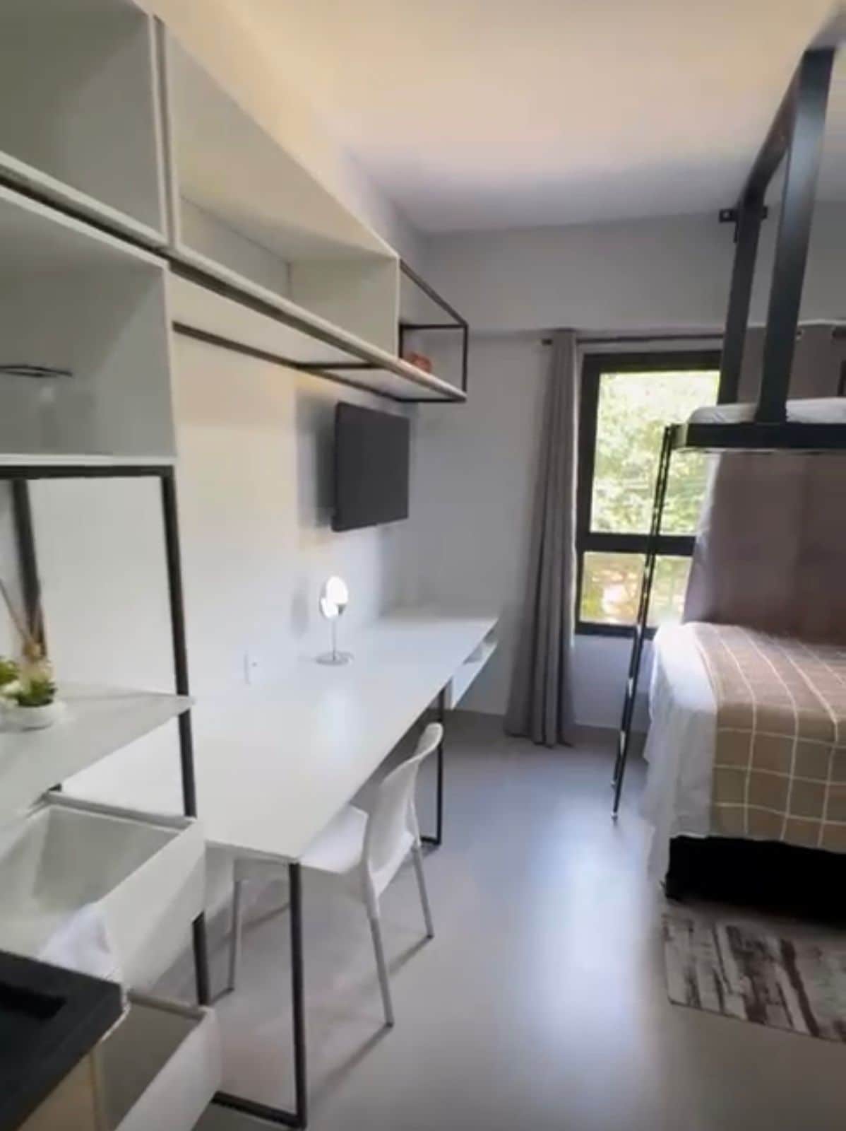 ¡Excelente estudio en Guarulhos! Justo a la salida de Dutra. Situado en el centro de Guarulhos, a 15 minutos del aeropuerto y a 25 minutos de São Paulo. El estudio cuenta con cocina completa además de cafetera Nespresso, licuadora y filtro. También cuenta con un espacio de oficina en casa para que pueda trabajar con tranquilidad. En el dormitorio hay un armario, una cama queen y toda la ropa de cama. Edificio nuevo con estacionamiento, piscina, gimnasio, lavandería, sala de reuniones y conserjería 24 horas.