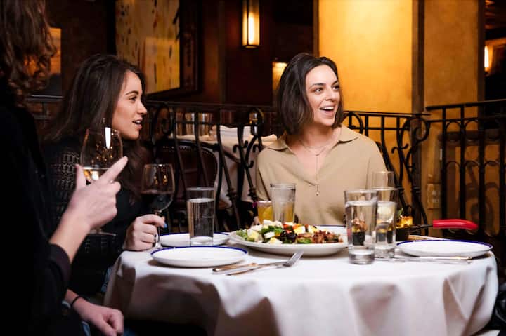 Asistir a un espectáculo de teatro y luego charlar mientras se disfruta de la comida y la bebida