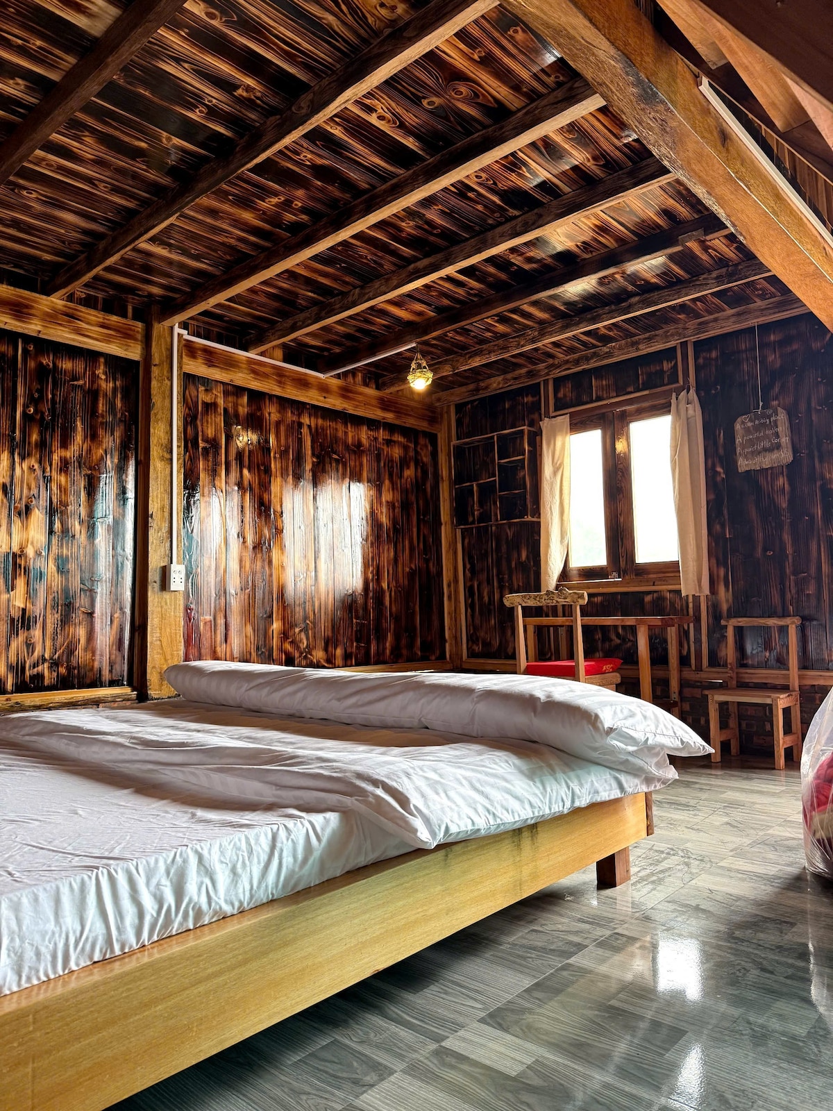 Diseñamos nuestro alegre bungalow inspirado en una casa tradicional de Red Dao (nuestra tribu), con una estructura de madera resistente, ladrillos rojos y maderas preciosas. Las aberturas de vidrio debajo del techo mejoran la luz natural. Hay una encantadora entreplanta para colchones adicionales, perfecta para alojar a niños felices o amigos. Todos los muebles y la decoración están hechos a mano, y las cadenas de luces crean un ambiente acogedor y encantador. ¡Disfrutá de tu propio baño privado justo al lado también! #EnjoyHappiness 😁😁😁