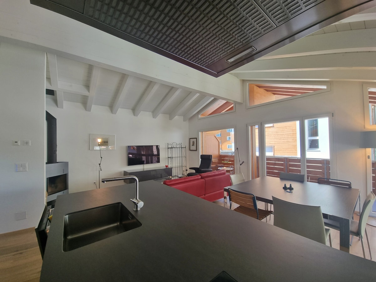 Jessica Sechs is a top floor duplex apartment conveniently situated in the town centre. The contemporary design mixes up-to-date technology with some traditional alpine touches. The fully equipped kitchen includes a state-of-the-art Miele coffee machine. A large log fire opens on two sides into the dining and sitting areas. A large south facing balcony adjacent to the sitting area captures afternoon sun. WiFi is accessible throughout the property. Wellness and ski rooms in the basement.