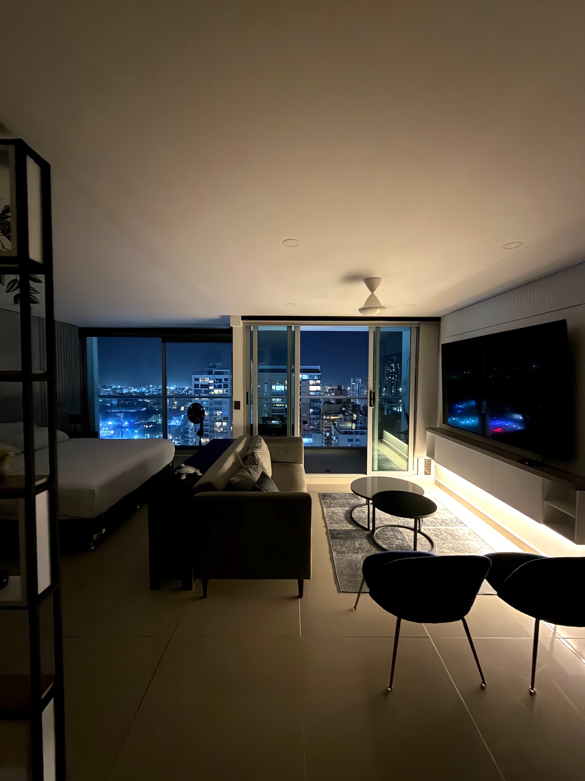 ¡Tu estancia perfecta para vacaciones o negocios! Disfruta de este hermoso estudio con Smart TV y espacio de trabajo, ideal para relajarte o trabajar cómodamente. Ubicado a solo 5 minutos de centros comerciales, restaurantes, bancos y transporte, en un edificio con: ✅ Lobby tipo hotel y parqueadero ✅ Coworking, gimnasio y sala de juegos ✅ Terraza con mirador, jacuzzi y seguridad 24/7 Además, disfruta de nuestro mini bar por un costo adicional. ¡Reserva ahora!