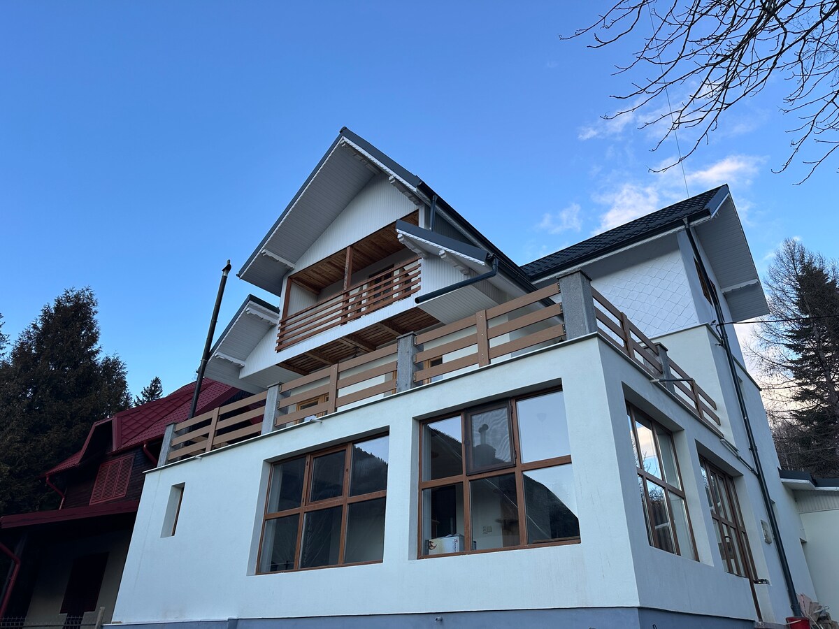 Enjoy the magnificent scenery in a private mountain resort, 5 min away from Brasov. The villa has huge terraces and balconies with spectacular mountain views and lots of comfy lounge chairs, Wi-Fi throughout the entire property, table tennis, table football, a large living room with fireplace, barbecue grill, covered outdoor dining place, a large variety of board games, on-site car park for up to 4 cars, including a garage. It is an ideal place to enjoy a relaxing holiday in Transylvania.