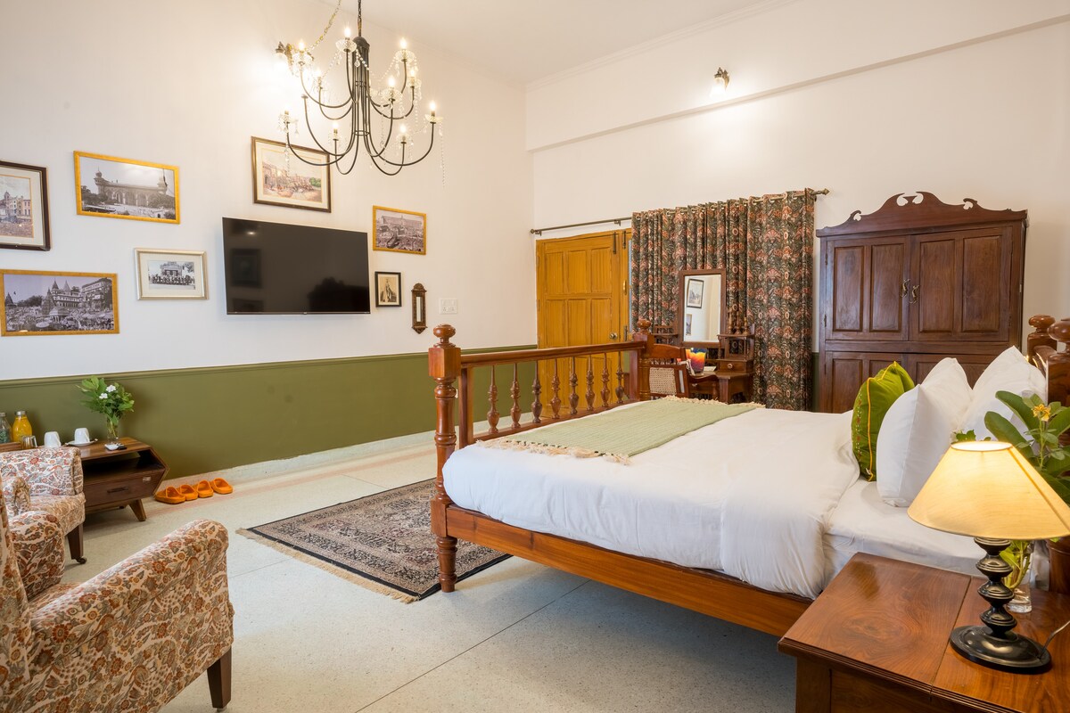 Seclude Nahan, Bantony Cottage : 2 Bedroom Royal Suite (Maharaja + Maharani Suite) Experience royal living in the hills with our 2-Bedroom Royal Suite at Seclude Nahan. This exclusive wing combines the elegant Maharaja and Maharani Suites, complete with a private living room, personal dining area, and stunning views of the Sirmour valley. Designed for families or two couples traveling together, the suite offers vintage charm, spacious comfort, and the warm hospitality of a private estate.